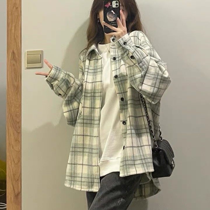 春秋韩系潮牌绿色格子衬衫女独特小众设计上衣百搭宽松慵懒风外套热门设计联盟服务商
